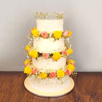 The ornamentation of these garden fresh pink and yellow roses all over this huge four-tiered cake make it look luxurious, sophisticated, and like a heavenly dream. The garnishing of Baby’s breath flower fillers makes this delicious vanilla cake look more divine and a delicacy that can teleport to you to heaven.