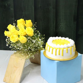 The amalgamation of 10 Yellow Roses and 1/2 Kg Butterscotch Cake is just the delight you need to deliver to your loved one and be a part of their celebration. Light up their day with dazzling roses and sweetness of the cake.