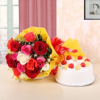 If you are planning to give someone a beautiful surprise, send this beautiful Gift Combo to them. It includes a Bouquet of 12 Assorted Roses, wrapped in Yellow paper along with a Half Kg Pineapple Cake