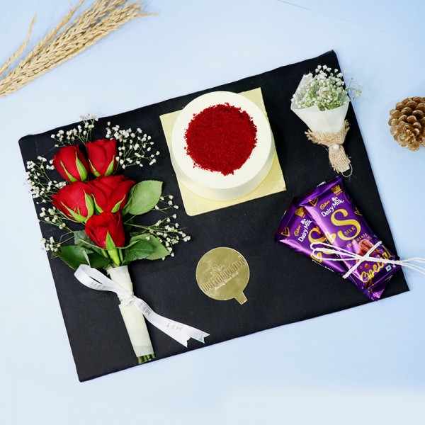 Celebrate Women’s Day with a beautifully curated giftplatter that exudes elegance and sweetness. Thisexquisite platter includes a stunning French bouquet ofroses, symbolizing love and admiration, a decadent redvelvet cake for a delicious treat, and 2 Cadbury Silkchocolates for a touch of indulgence. All these delightsare thoughtfully arranged in a reusable hamper tray,making it a perfect gift to show appreciation andcelebrate the special women in your life.